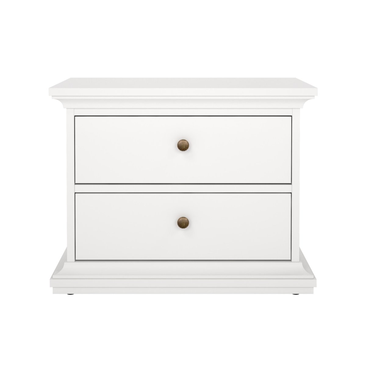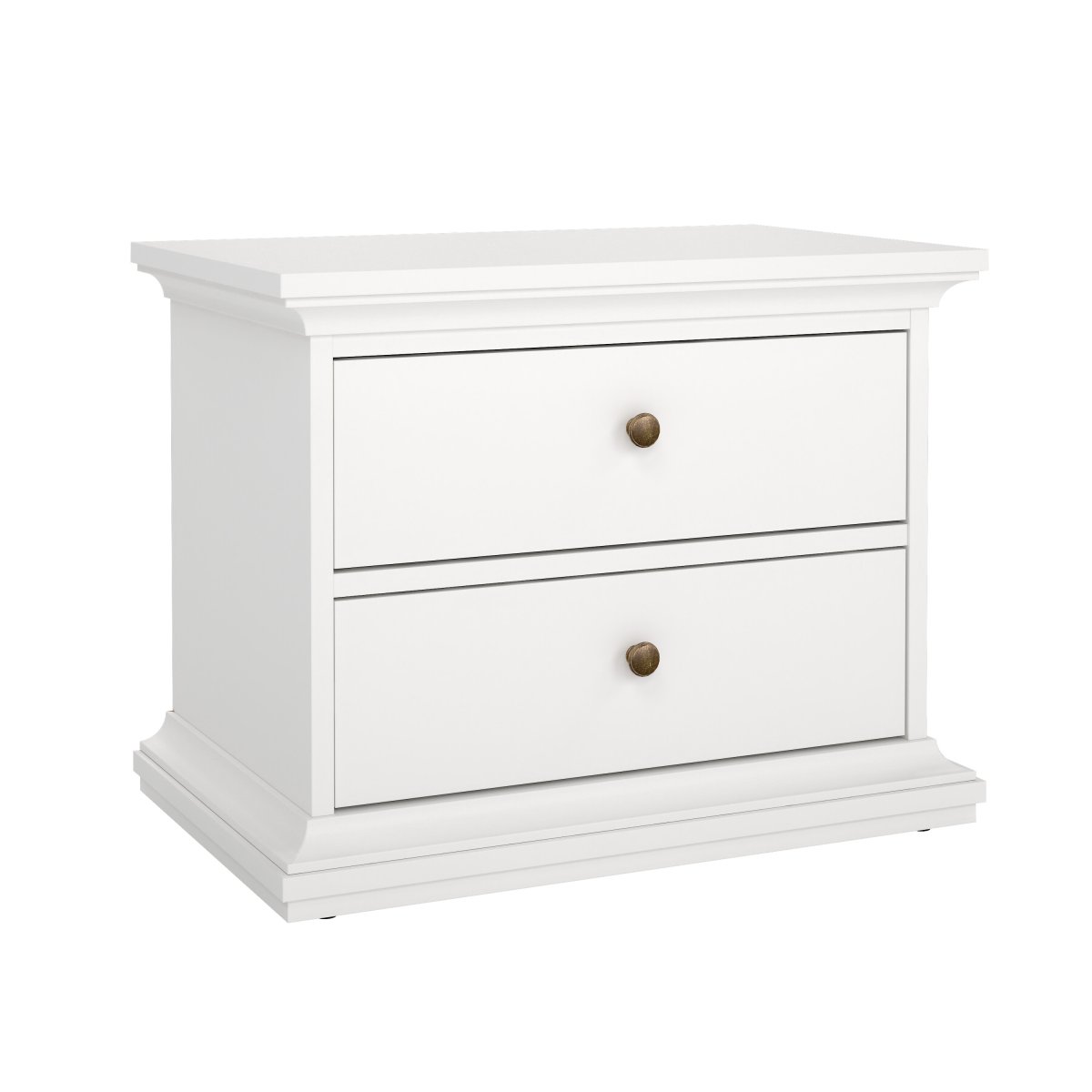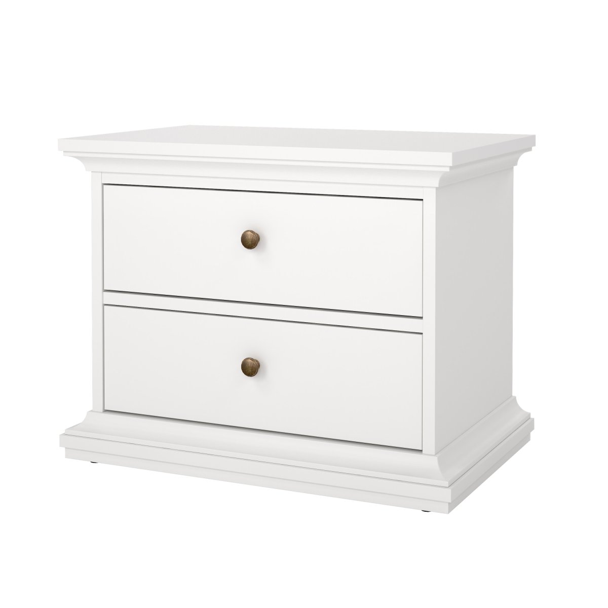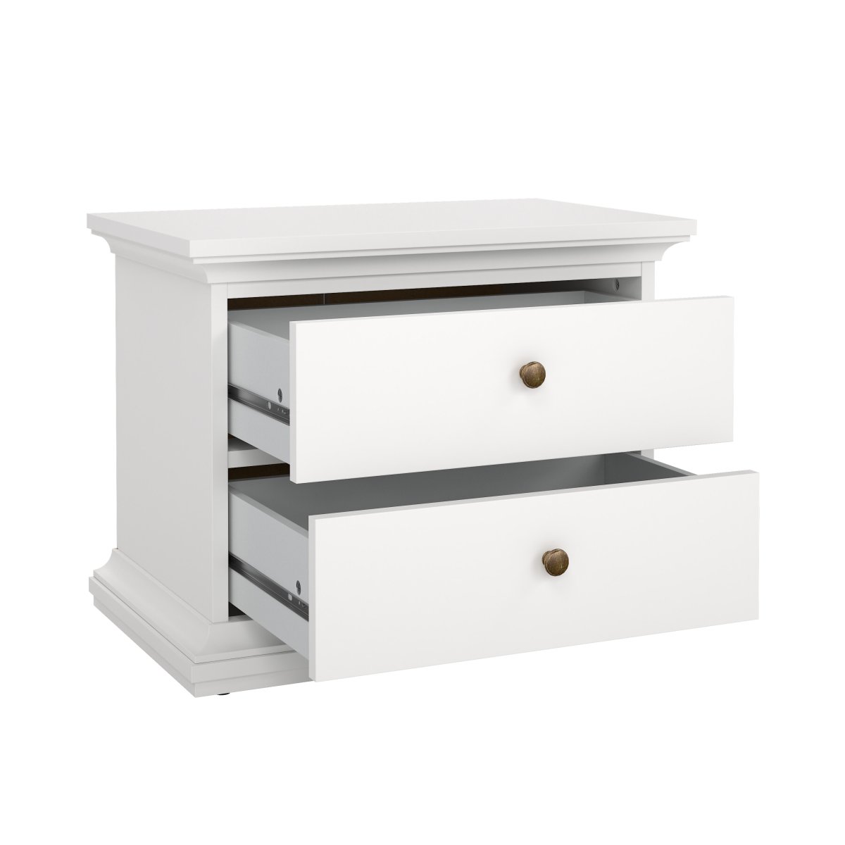 Zwei geräumige Schubladen auf kugelgelagerten Auszügen ermöglichen sanftes Öffnen und ordentlichen Stauraum für Bücher und Alltagsgegenstände. Stilschrauben an der Sockel ermöglichen das Ausgleichen von Bodenunebenheiten und sorgen für stabilen Stand. Perfekt als Ergänzung zu Paris-Betten oder separaten Boxmatratzen für ein stimmiges Schlafzimmerambiente.