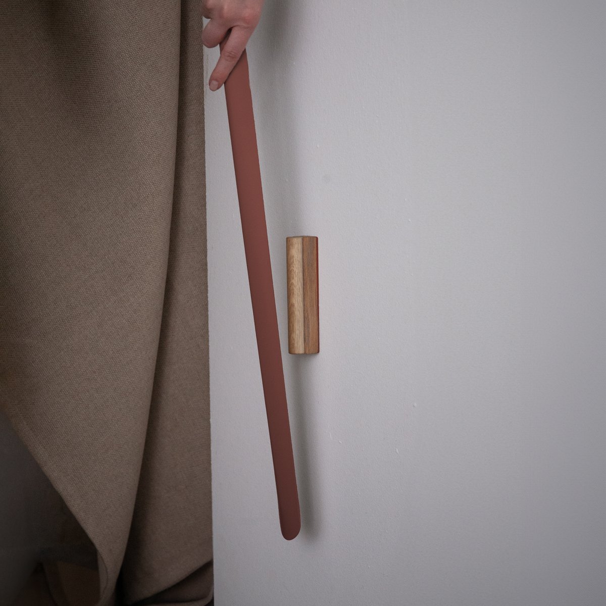 Der Schuhanzieher lässt sich nahtlos an einer magnetischen Holzhalterung an der Wand befestigen.