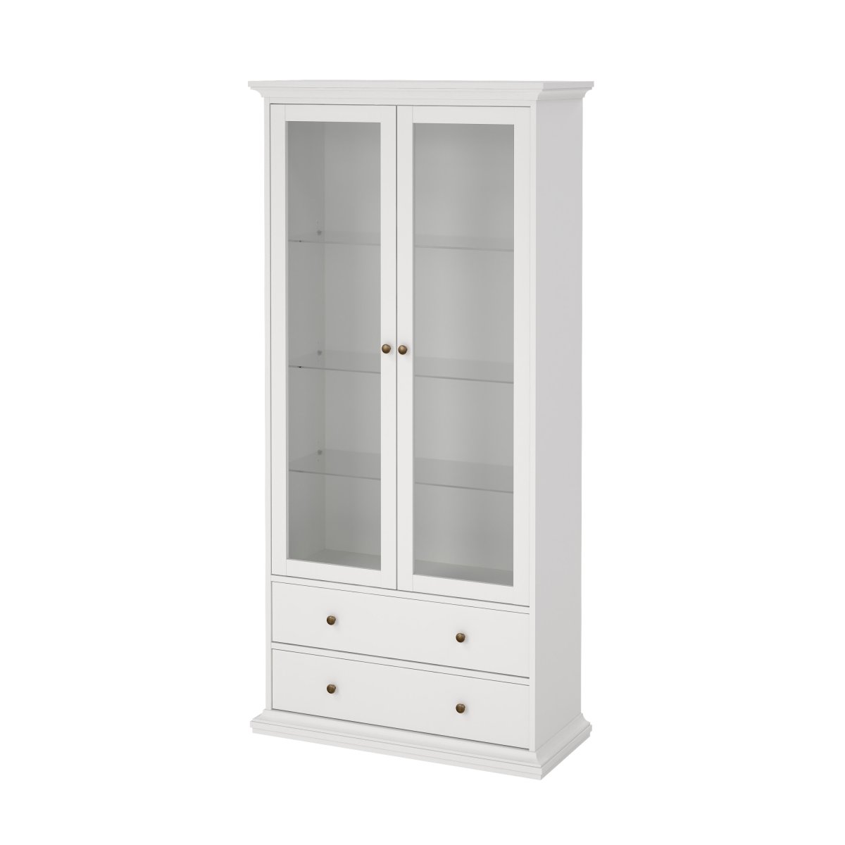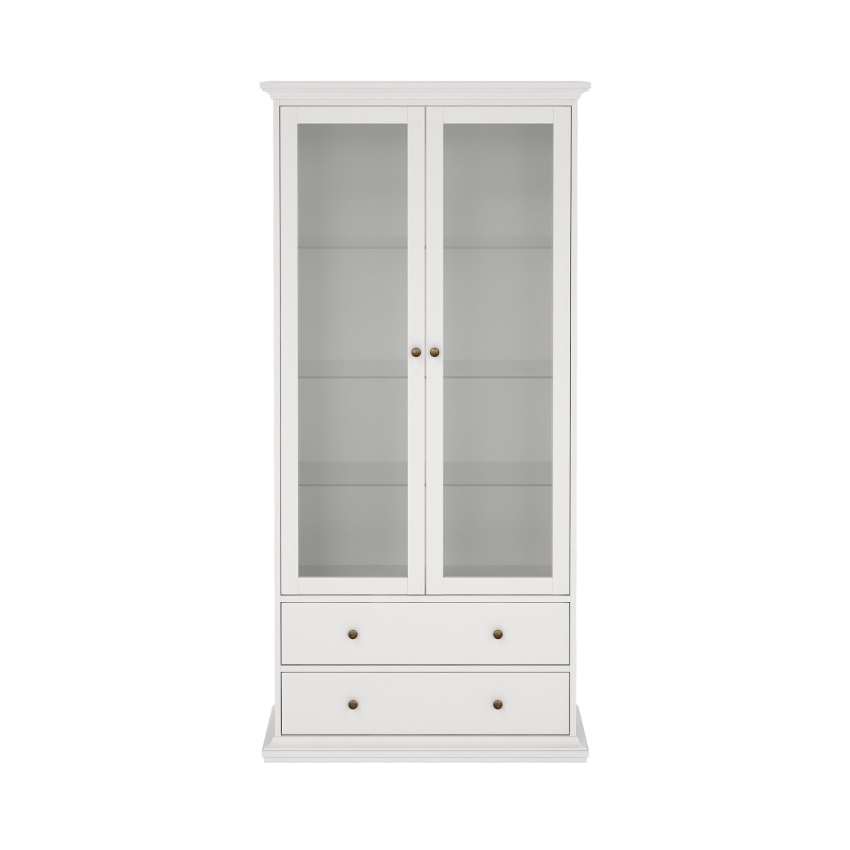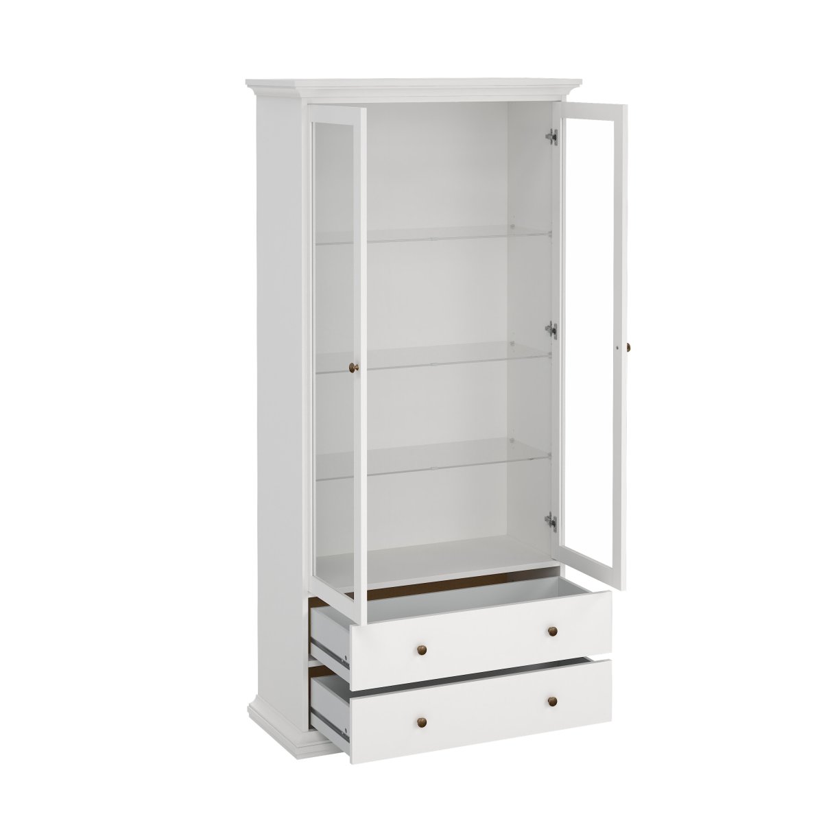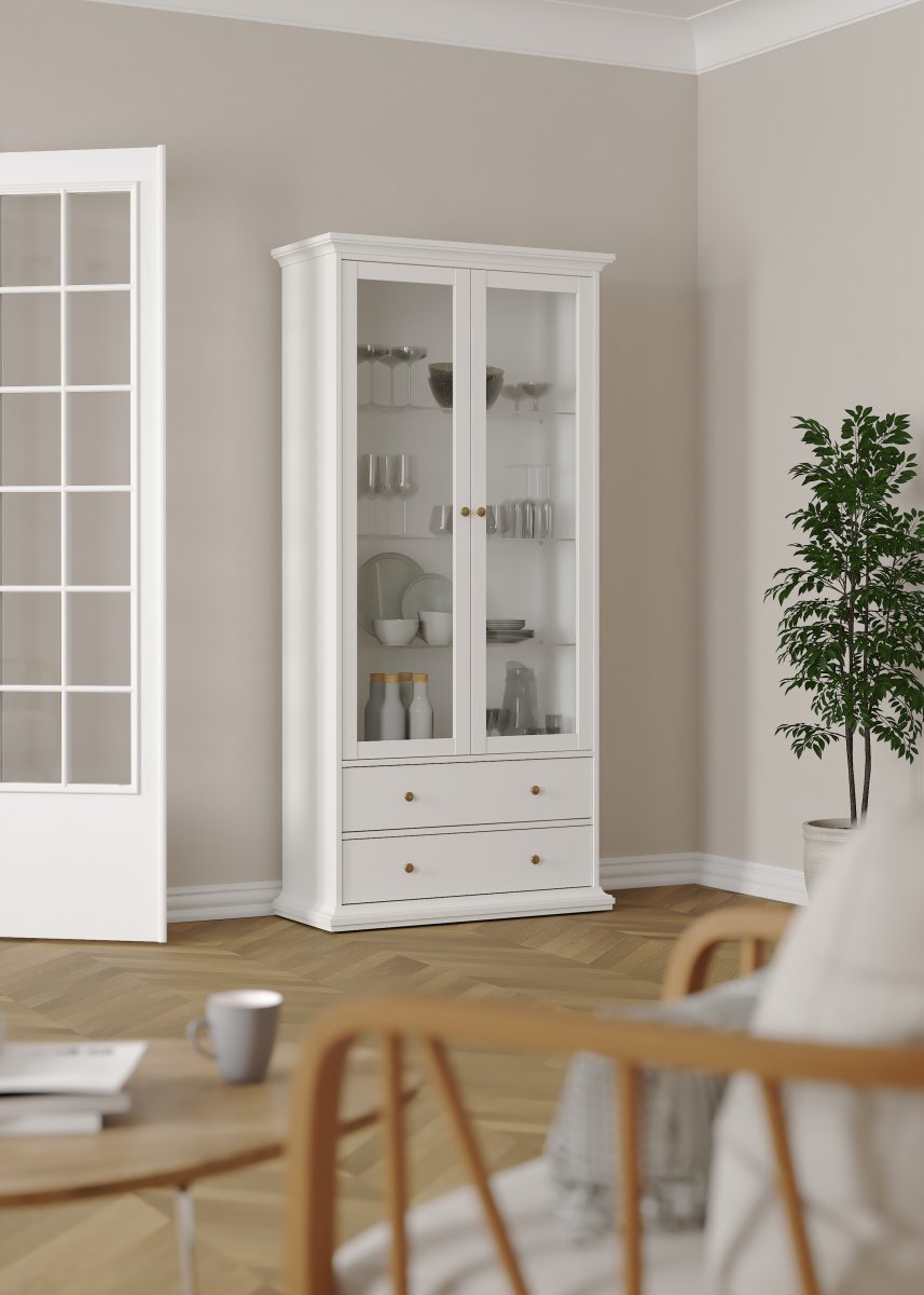 Der Vitrinenschrank aus der Paris-Serie bringt schlichte Eleganz in Ihr Zuhause mit seiner hellen, weißen Optik und den dezenten Griffen an den zwei Glastüren. Klare Linien und natürliche Farbtöne fügen sich unaufgeregt in Wohnzimmer oder Esszimmer ein und schaffen eine ruhige, stilvolle Atmosphäre. Er setzt Geschirr und Dekor ins richtige Licht, ohne den Raum zu dominieren.