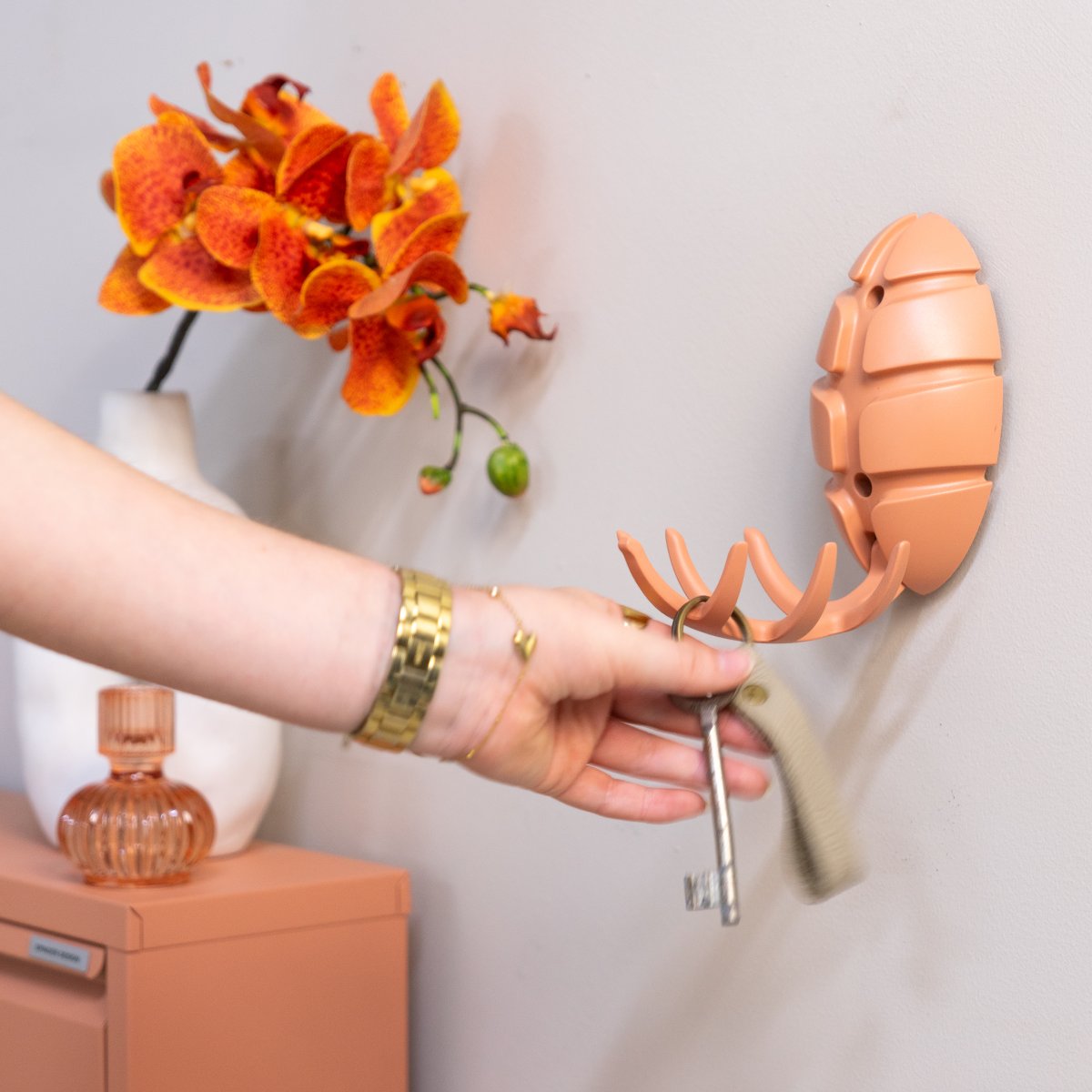 Die von Hans Daalder entworfene Wandgarderobe besticht durch ihr einzigartiges, von einem Käfer inspiriertes Design.