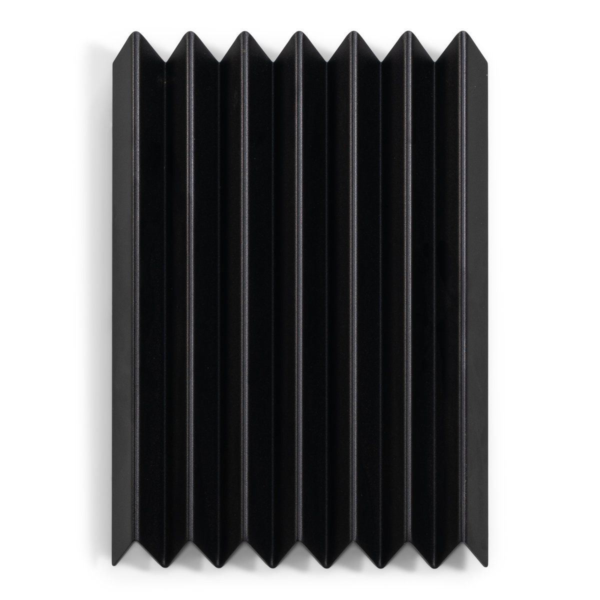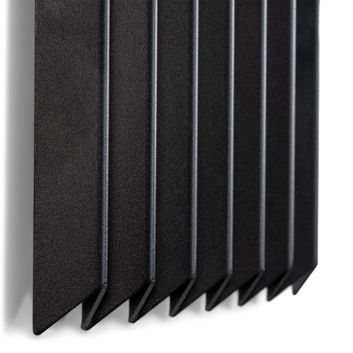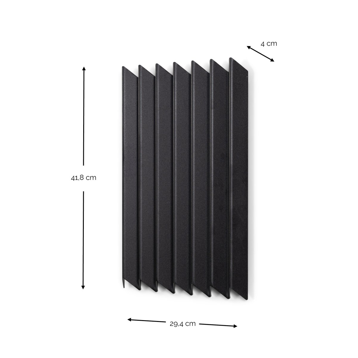 Die gefaltete Stahlplatte bildet an der Oberseite dezente Haken und bietet so eine praktische Lösung zum Aufhängen von Mänteln oder Taschen.