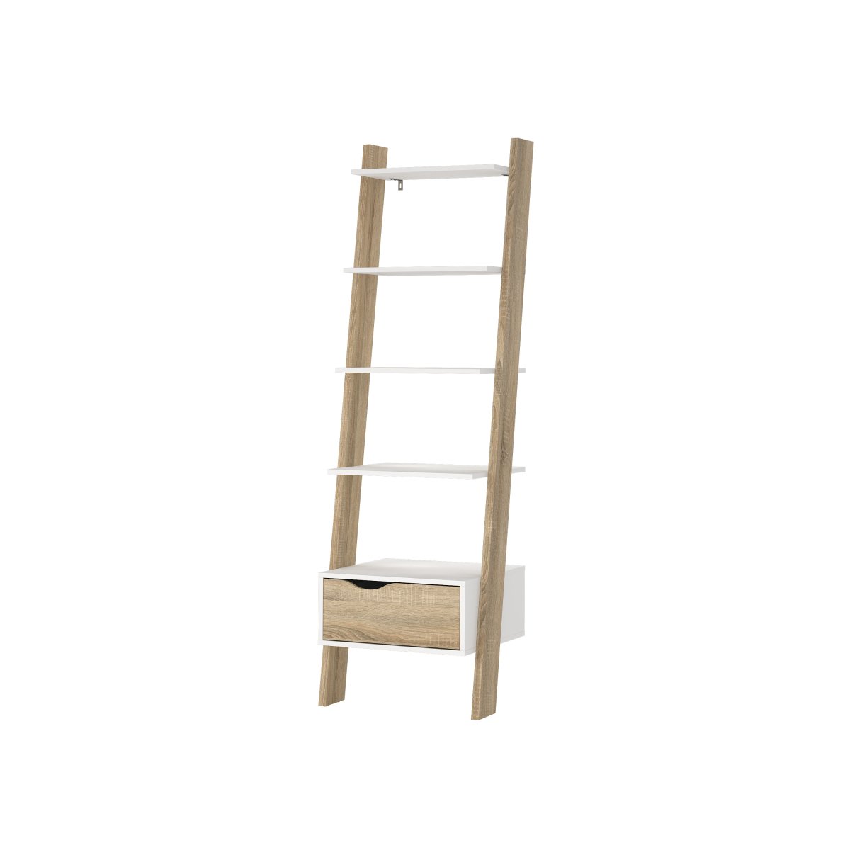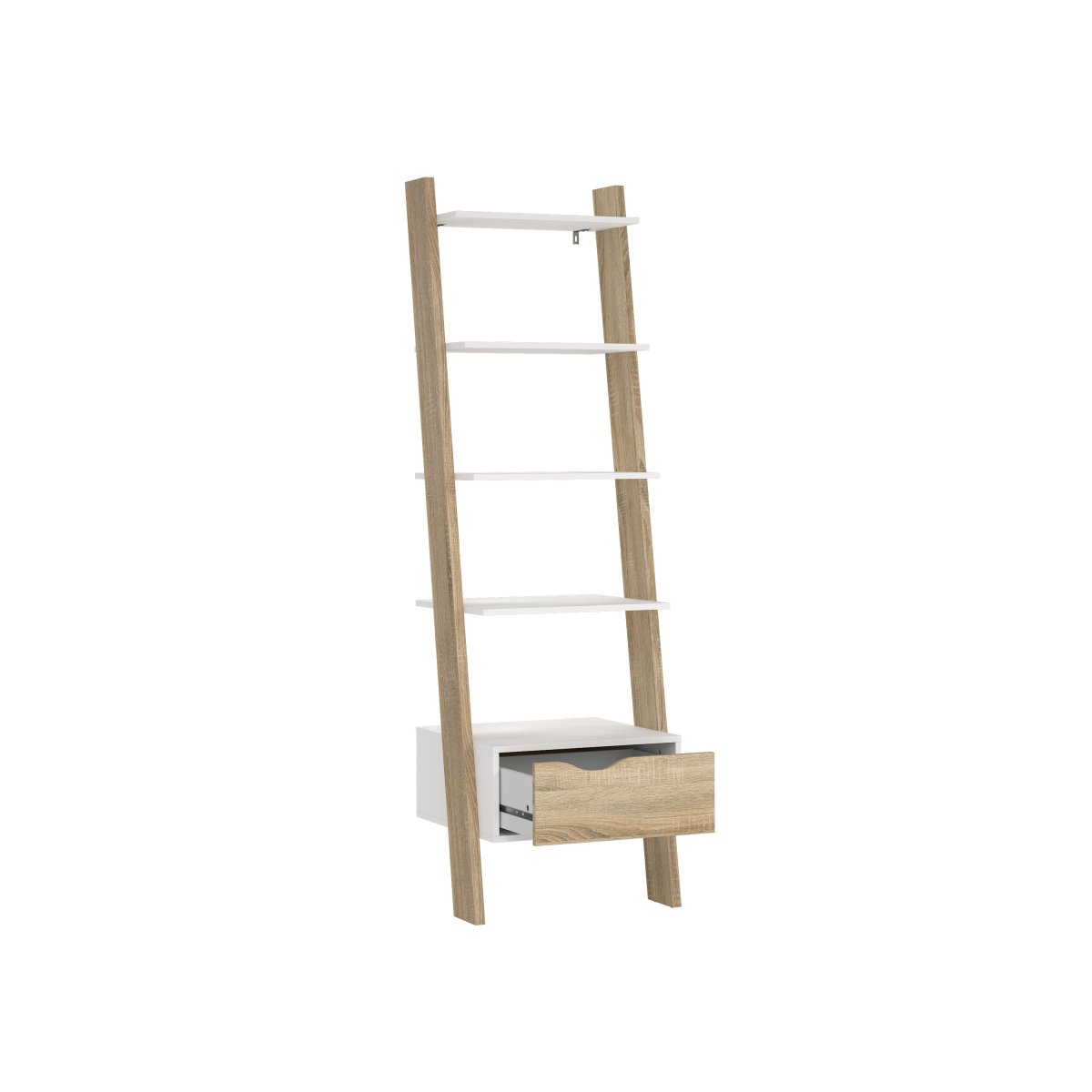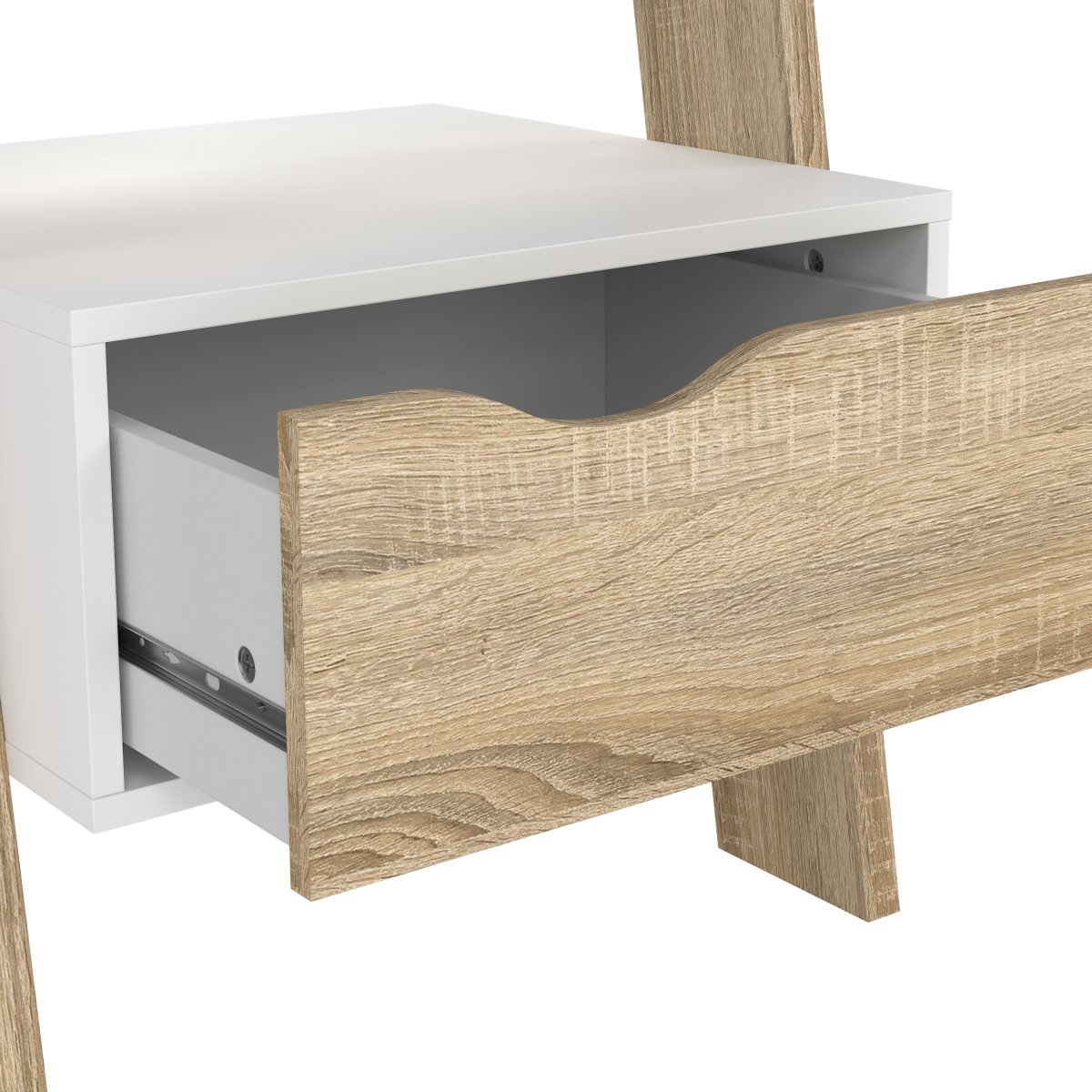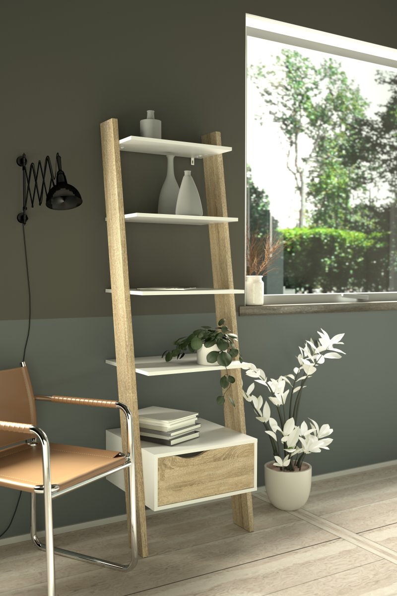 Die Delta Stigereol vereint asymmetrische Linien mit breiten Vangen in Eichenstruktur und schafft so eine warme, moderne Atmosphäre im Raum. Weiße Regalböden und Seiten sorgen für Leichtigkeit, während die eichenfarbene Schublade einen stilvollen Kontrast setzt.