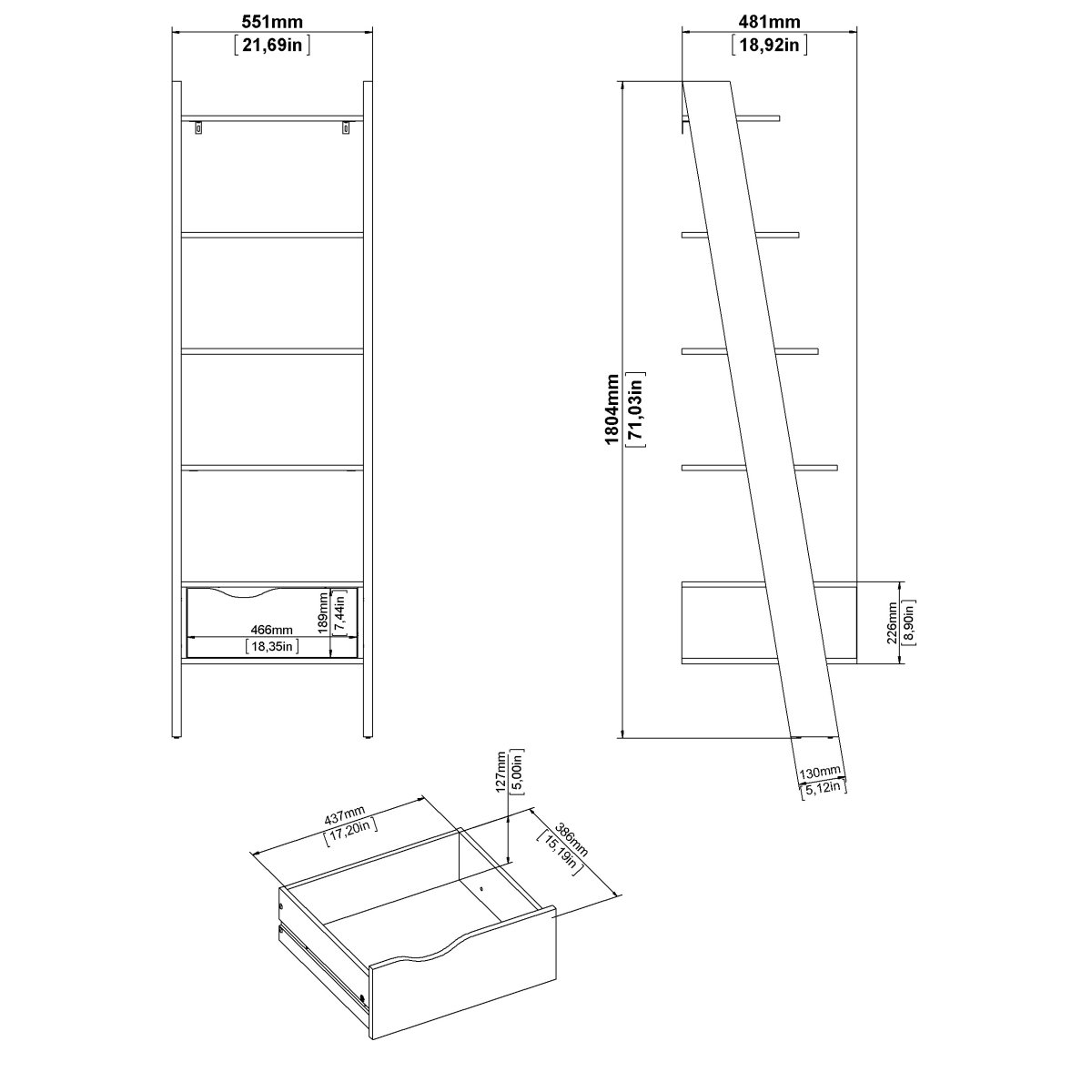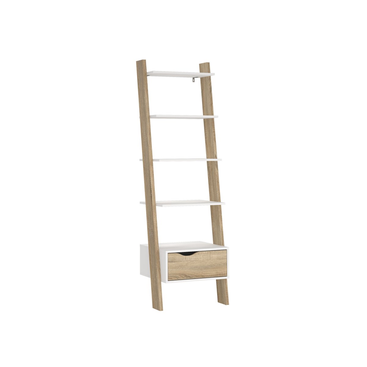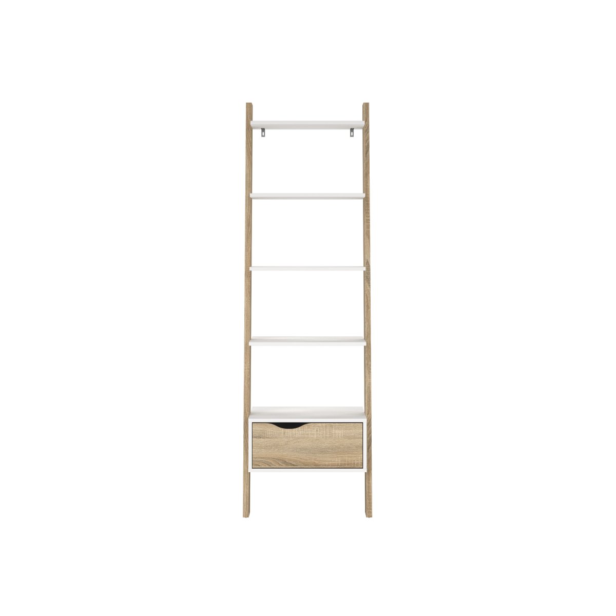 Die Delta Stigereol vereint asymmetrische Linien mit breiten Vangen in Eichenstruktur und schafft so eine warme, moderne Atmosphäre im Raum. Weiße Regalböden und Seiten sorgen für Leichtigkeit, während die eichenfarbene Schublade einen stilvollen Kontrast setzt.