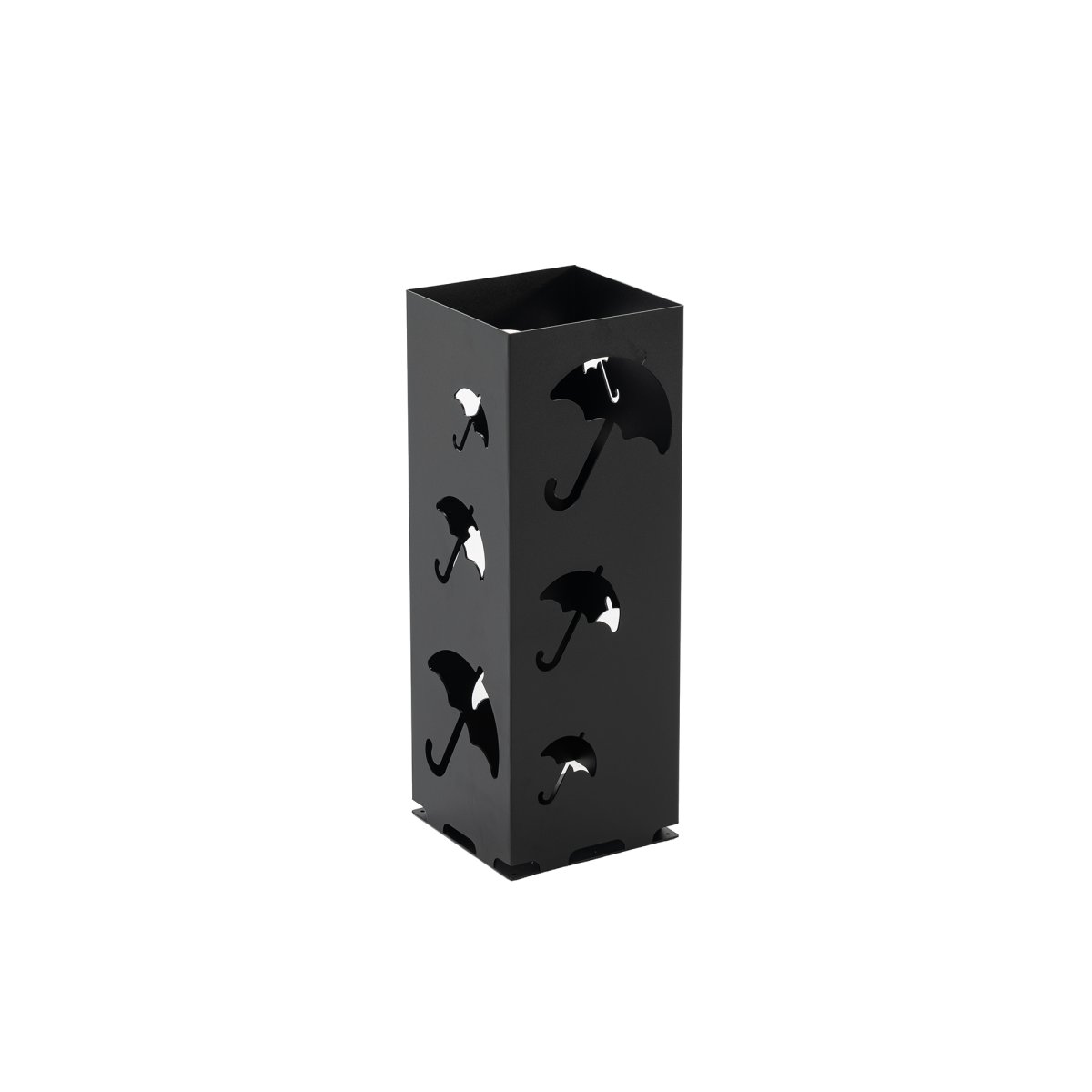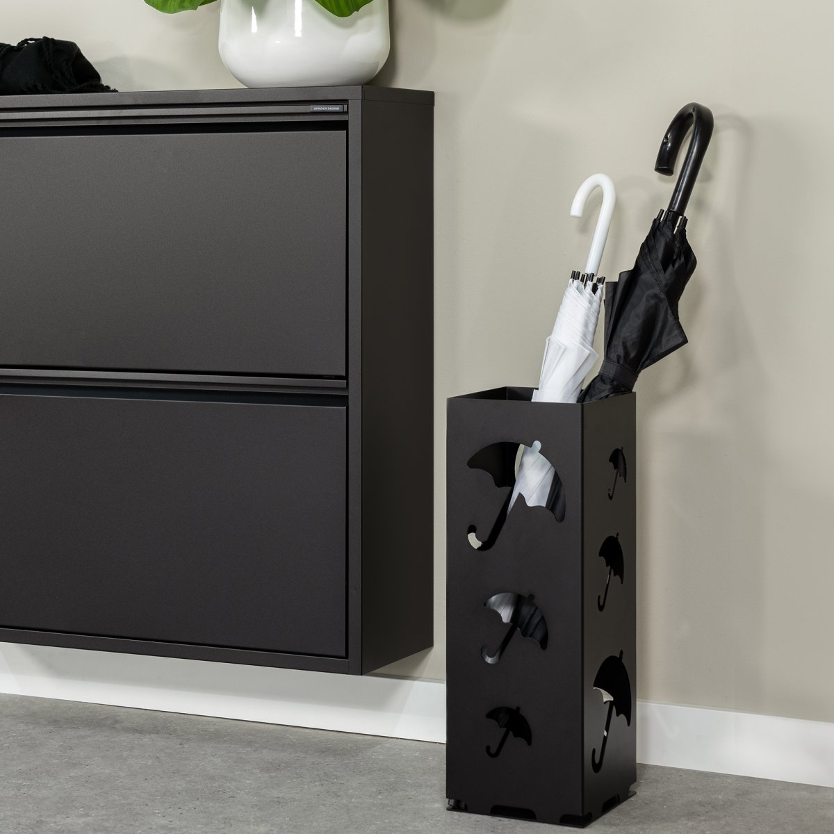 Der Schirmständer ist aus robustem Stahl gefertigt, platzsparend und pflegeleicht.