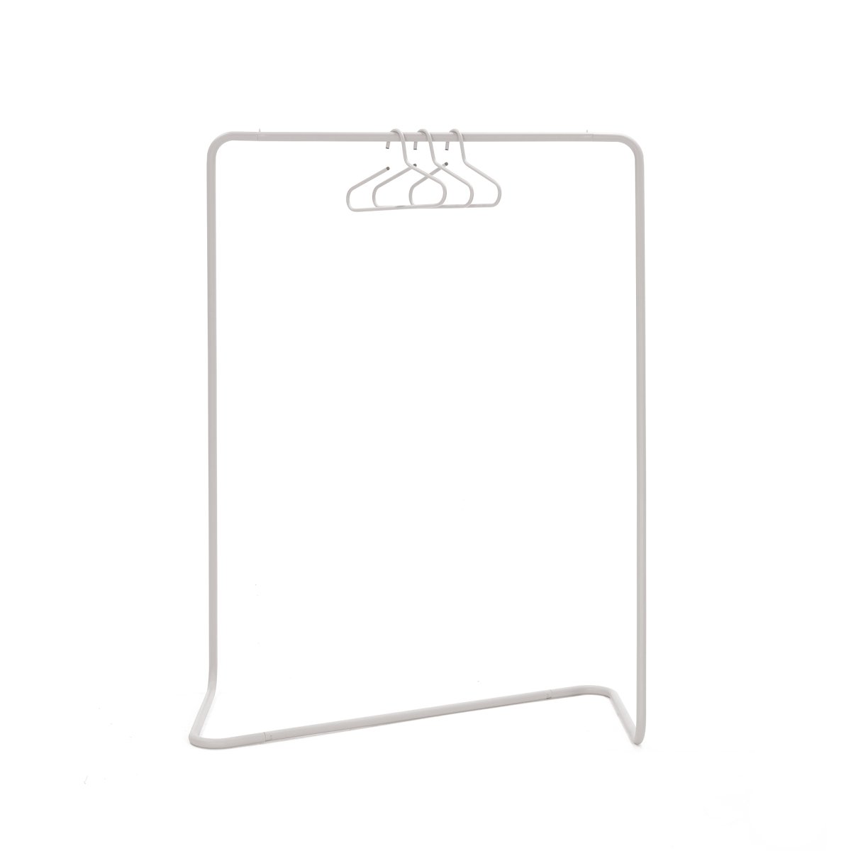 Die horizontale Oberstange ist mit zwei Stahlstoppern ausgestattet, die das Verrutschen der Kleiderbügel verhindern, während der robuste Stahlrahmen für ein modernes und langlebiges Design sorgt.