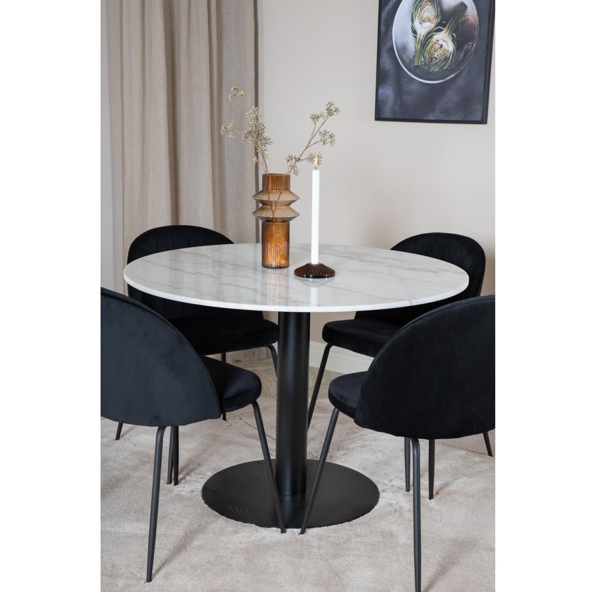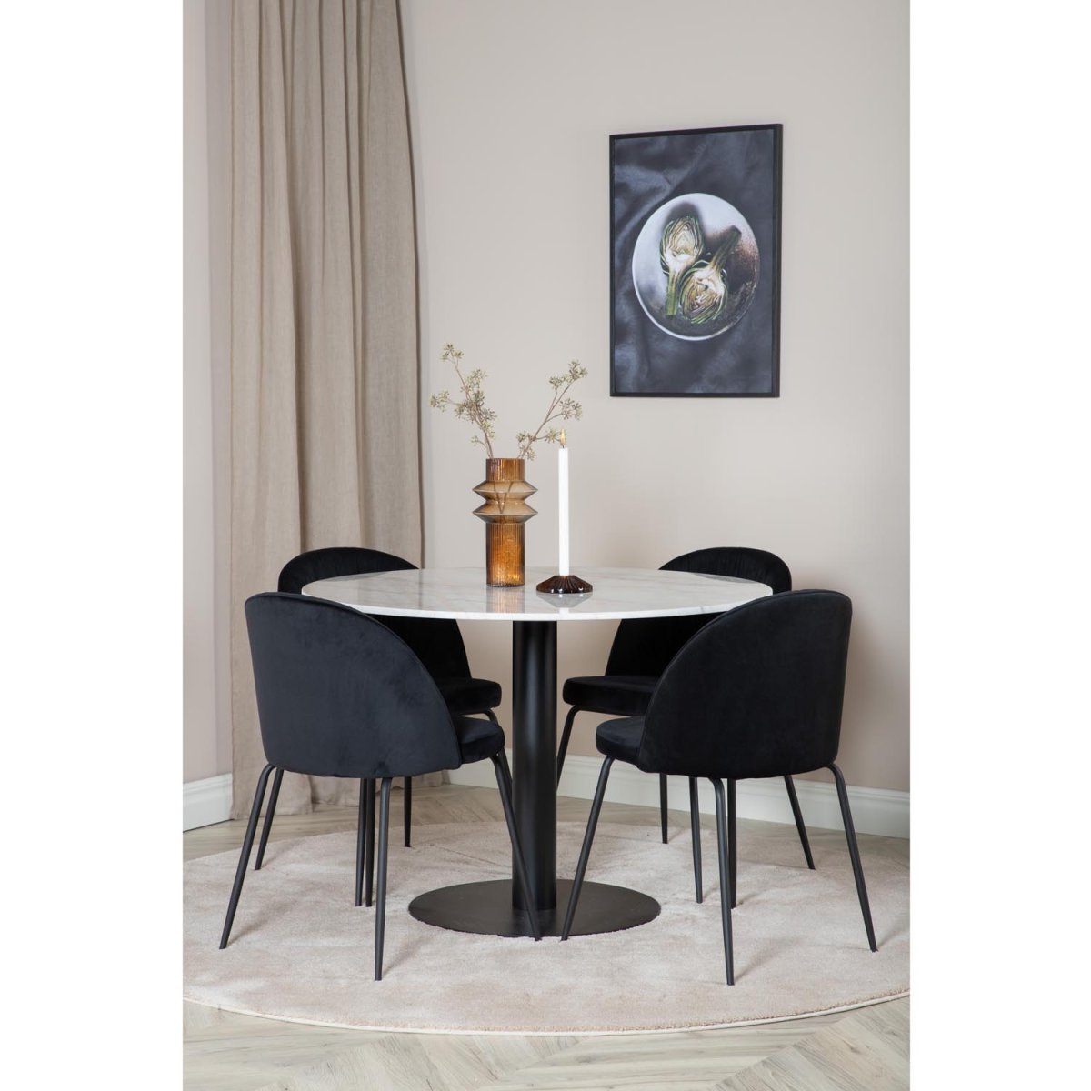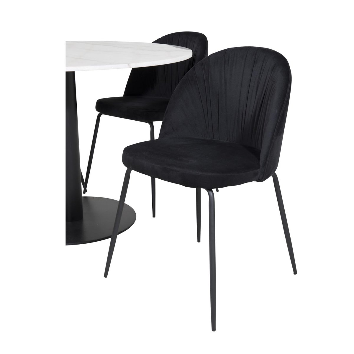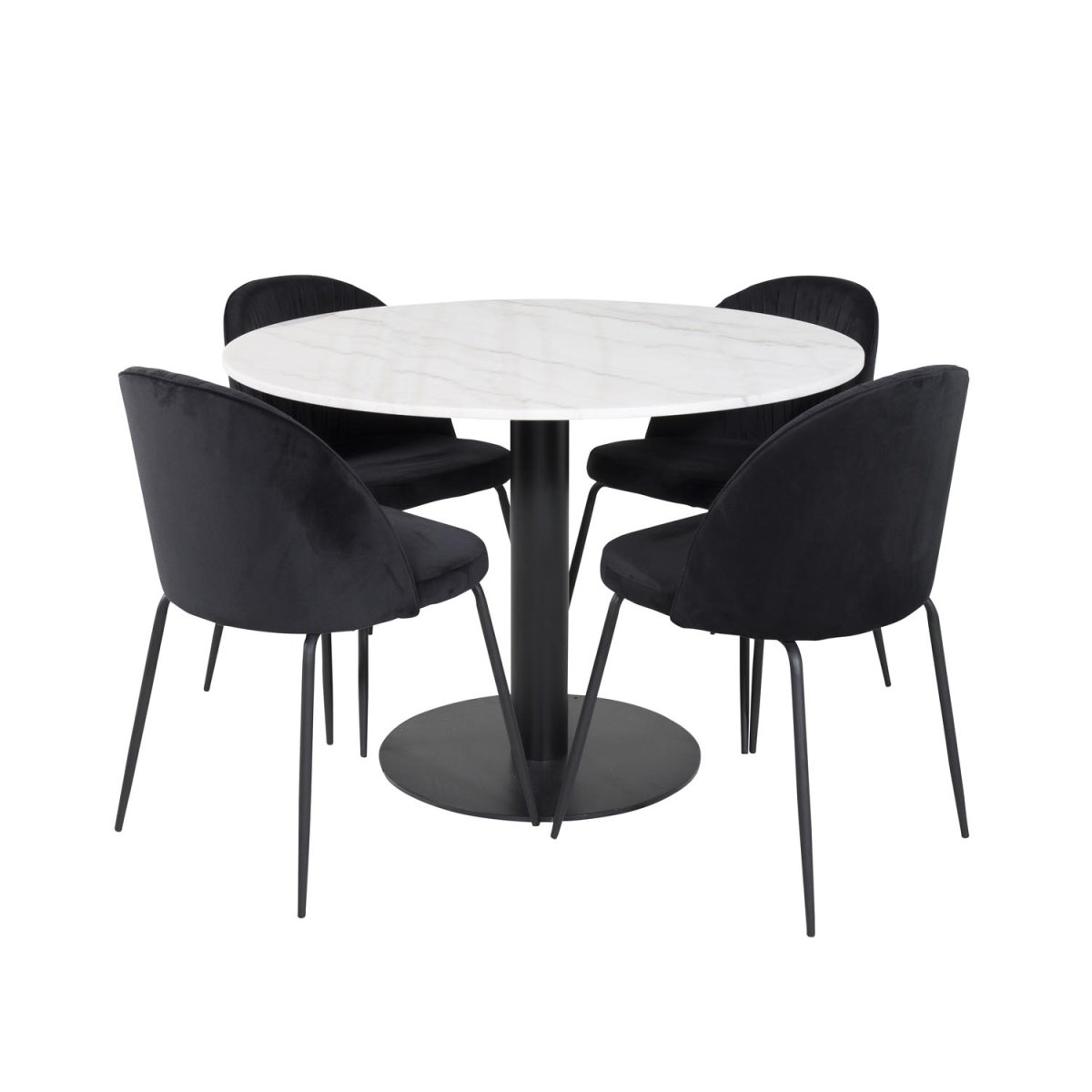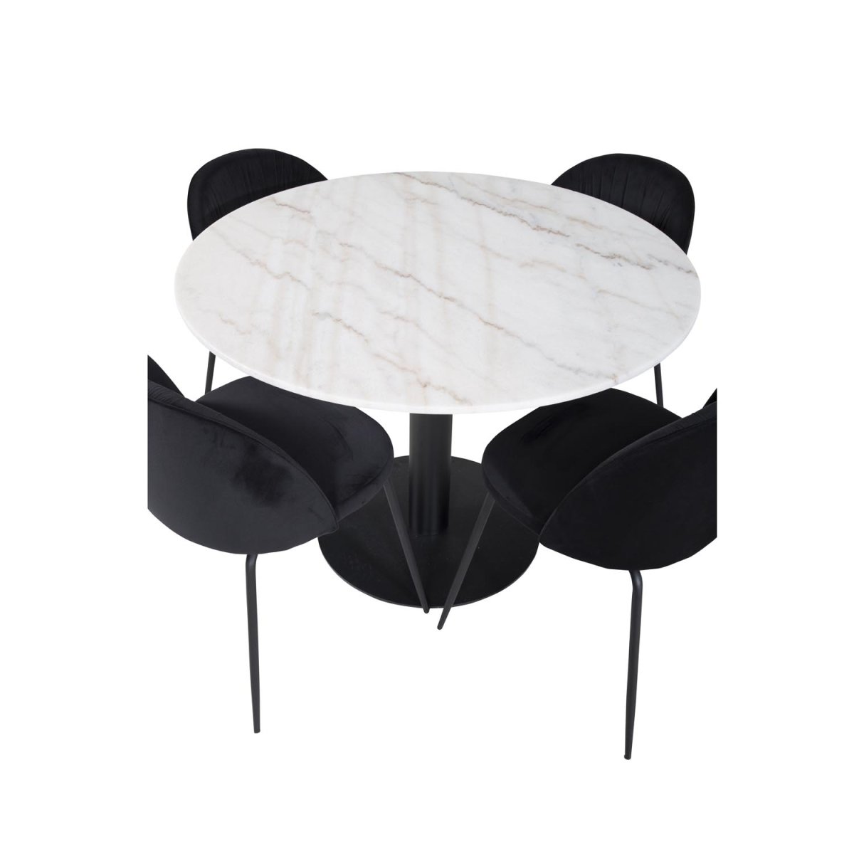 VENTURE DESIGN Estelle Esstisch-Set, mit 4 Stühlen – weißer Marmor/schwarzes Metall und schwarzer Stoff/schwarzes Metall
