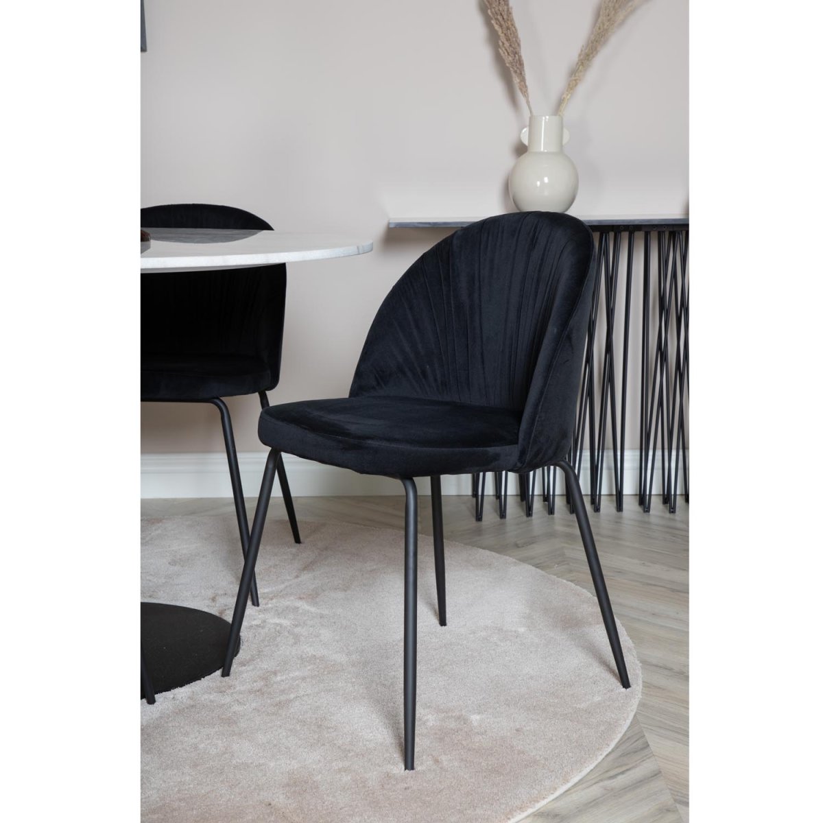 • VENTURE DESIGN Estelle Esstisch-Set, mit 4 Stühlen – weißer Marmor/schwarzes Metall und schwarzer Stoff/schwarzes Metall